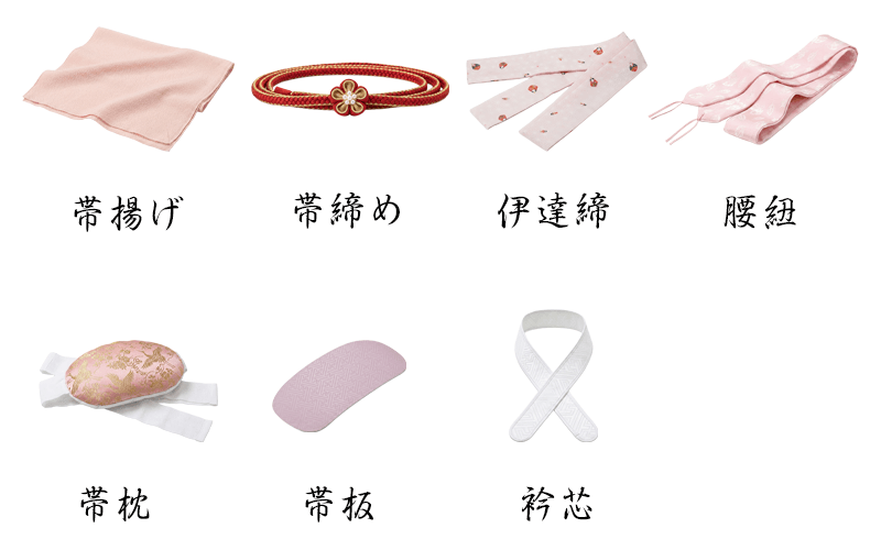 着物、袋帯、長襦袢(半衿付き)、肌着(肌襦袢・裾除け)、足袋、帯揚げ、帯締め、帯枕、帯板(前板)、腰紐(4〜5本)、伊達締め(2本)、衿芯、コーリンベルト、補正用タオル(3〜4枚)、草履、バッグ